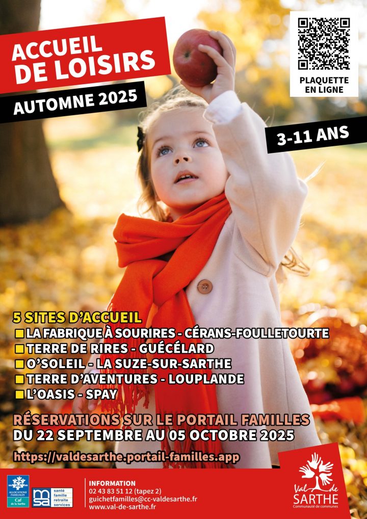 Les inscriptions ALSH pour les vacances d’automne se déroulent du 22 septembre au 5 octobre sur le Portail Familles. Inscription en ligne : https://valdesarthe.portail-familles.app/