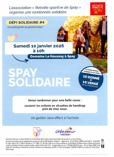 L’association La retraite sportive de Spay organisera une randonnée solidaire samedi 10 janvier à 10h au Domaine du Houssay.
